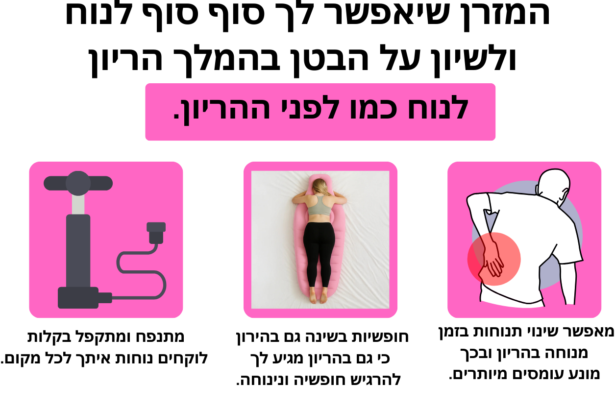 • "המגבלה בתנוחות הייתה החלק הכי מתסכל בהריון בשבילי. המזרן עזר לי למצוא מחדש את השקט – גם לשכב על הבטן וגם לשחרר עומס בגב."
